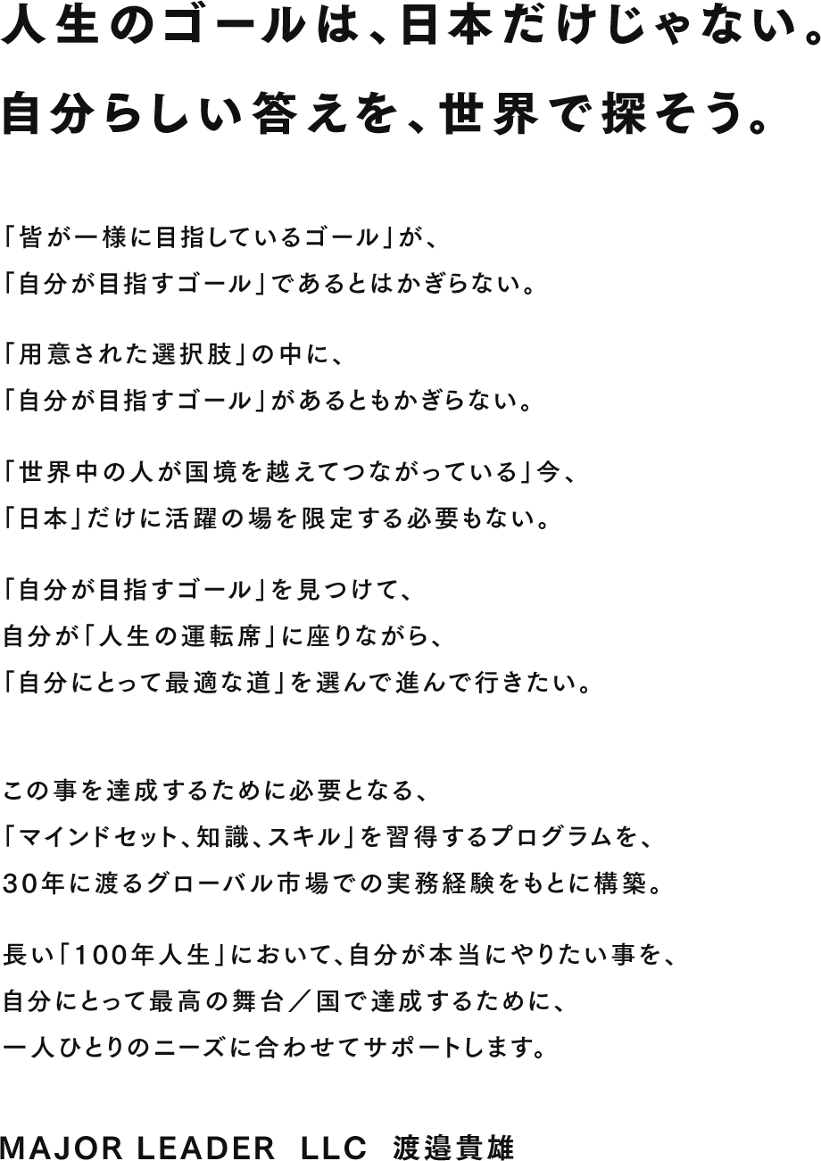 同時に、30年以上に渡る国内外での実務経験を踏まえ、次世代がグローバル・リーダーとして活躍していくことをサポートすべく、MAJOR LEADER LLCに参画。